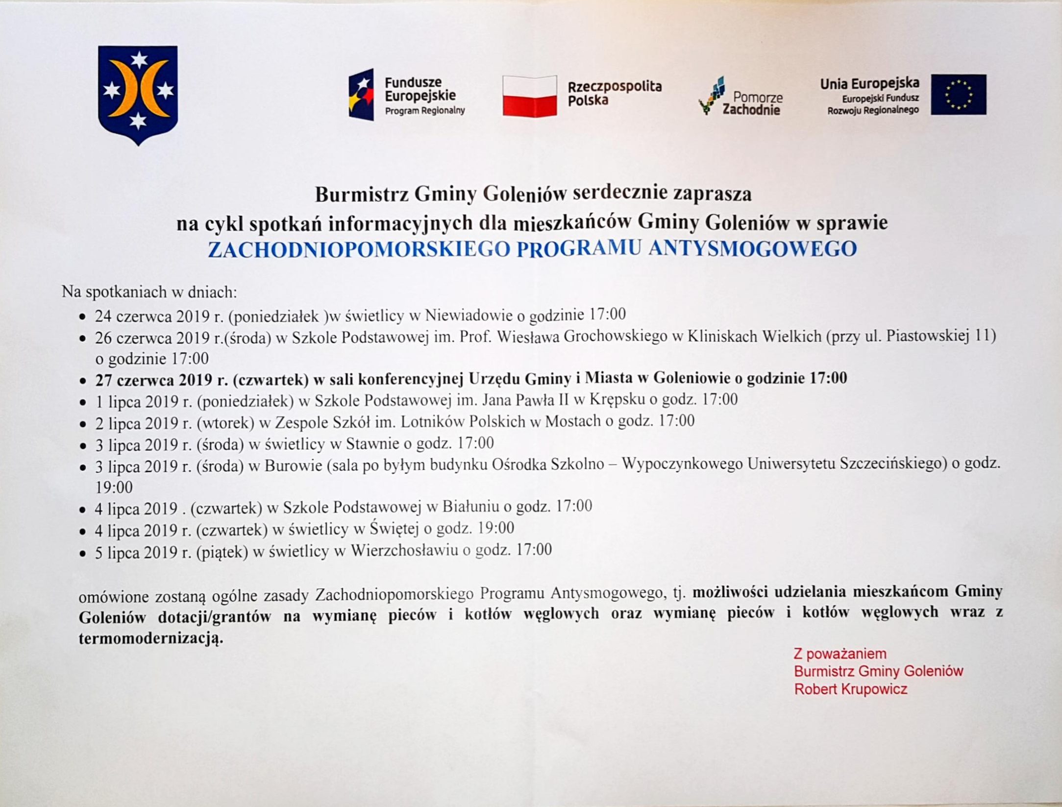 Cykl spotkań dla mieszkańców Gminy Goleniów w sprawie programu antysmogowego